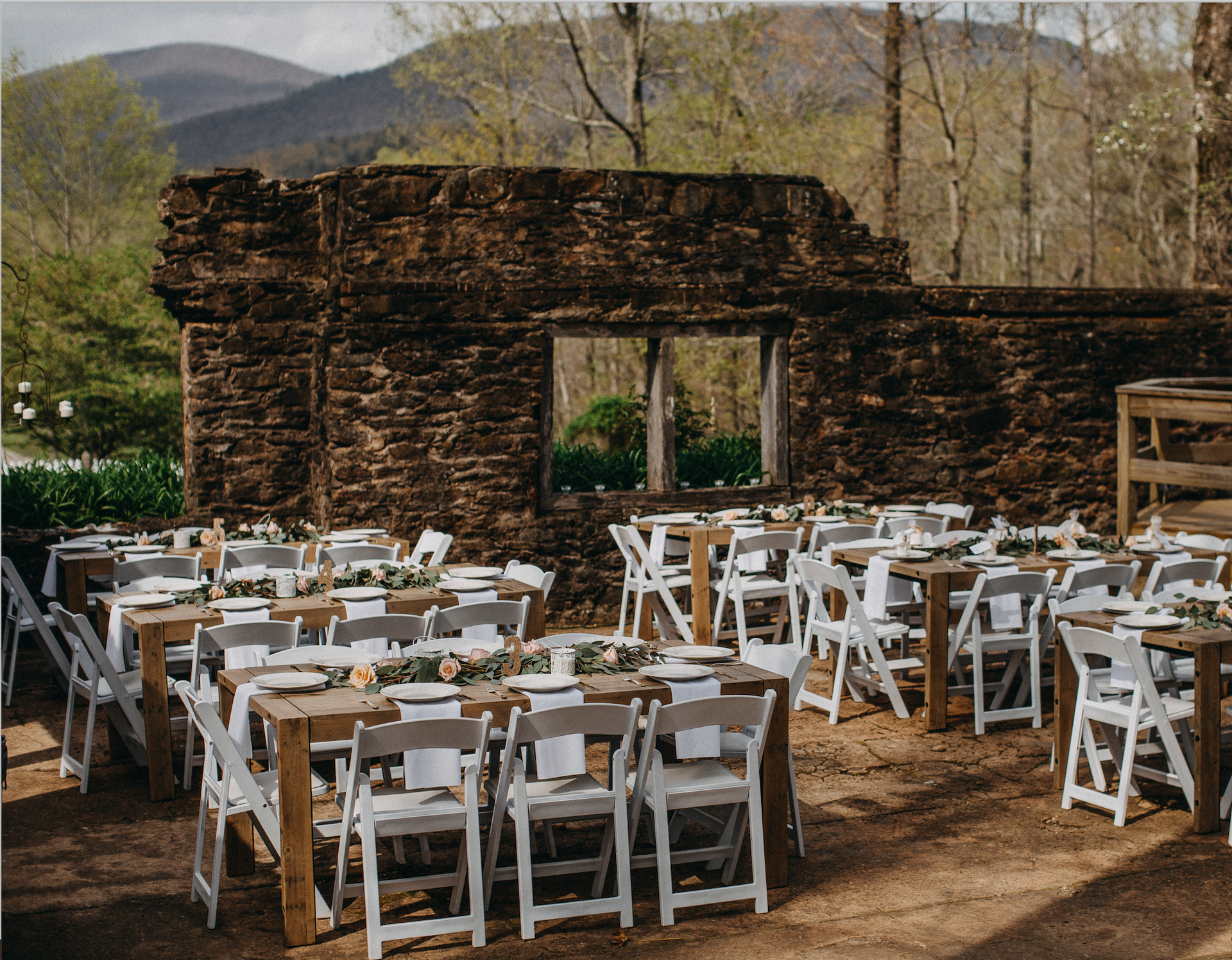 Nestled in the North Georgia mountains, this unique venue features the stone ruins of an old schoolhouse surrounded by scenic landscapes. It’s a perfect blend of history and rustic charm, ideal for outdoor gatherings with a touch of romance. You can't go wrong with a Custom Soirees photobooth for your North Georgia Event at this unique venue or even a neon sign to welcome your guests!